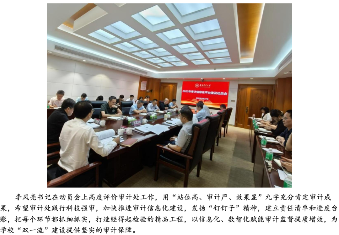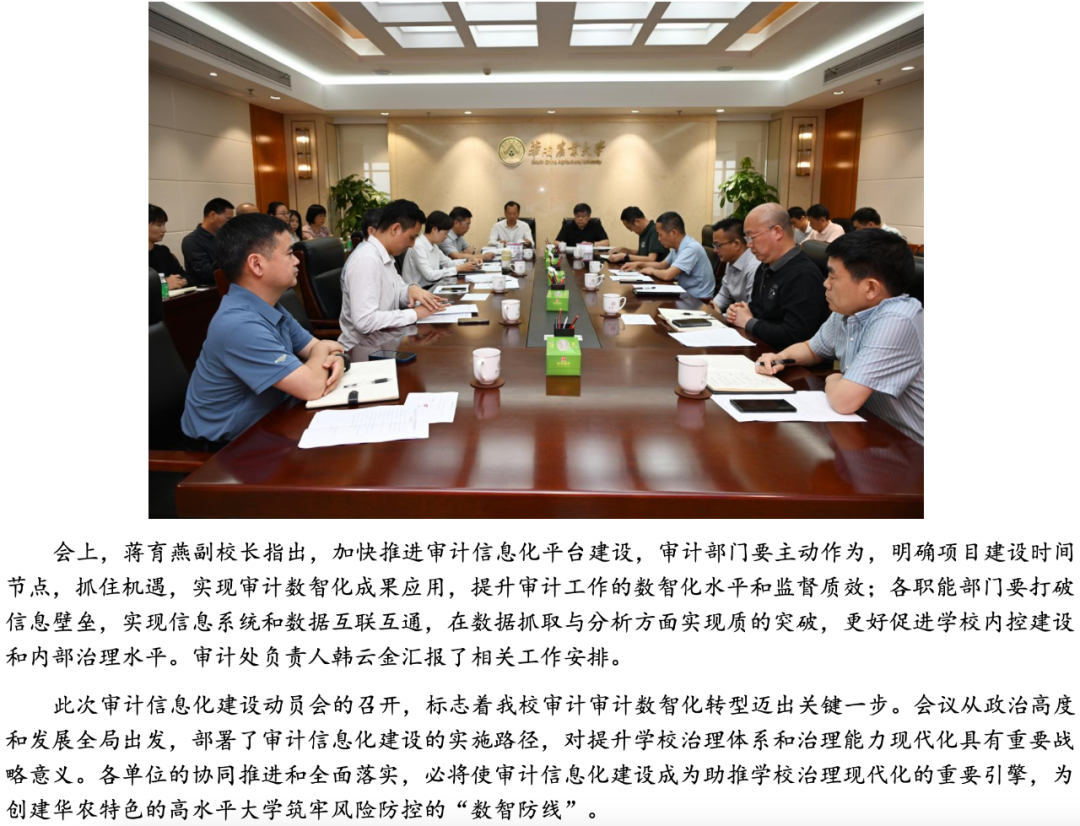 華南農大審計處領導以實地研討為基礎,赴北京、天津、山東等地區的高校開展內部審計轉型升級經驗調研。調研結束后,華南農大于4月27日召開審計信息化建設動員會,本次動員會受到華南農大校黨委及校領導的高度重視。