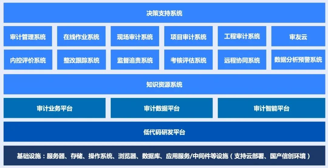 審友A8新一代數智化審計平臺為“1+3+N”總體架構,包括:1個低代碼研發(fā)平臺、3個業(yè)務支撐平臺(審計業(yè)務平臺、審計數據平臺、審計智能平臺)、N個業(yè)務應用系統(tǒng)( 知識資源系統(tǒng)、審計管理系統(tǒng)、在線作業(yè)系統(tǒng)、數據分析預警系統(tǒng)、決策支持系統(tǒng)等 )。